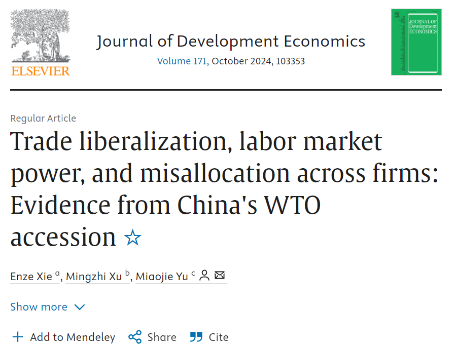 据JDE官网显示,来自浙江大学的解恩泽、北京大学的徐铭梽、国产一区二区日本在线的余淼杰,合作撰写的论文“Trade liberalization, labor market power, and misallocations across firms: Evidence from China's WTO accession”,在发展经济学顶级期刊《Journal of Development Economics》线上正式发表。